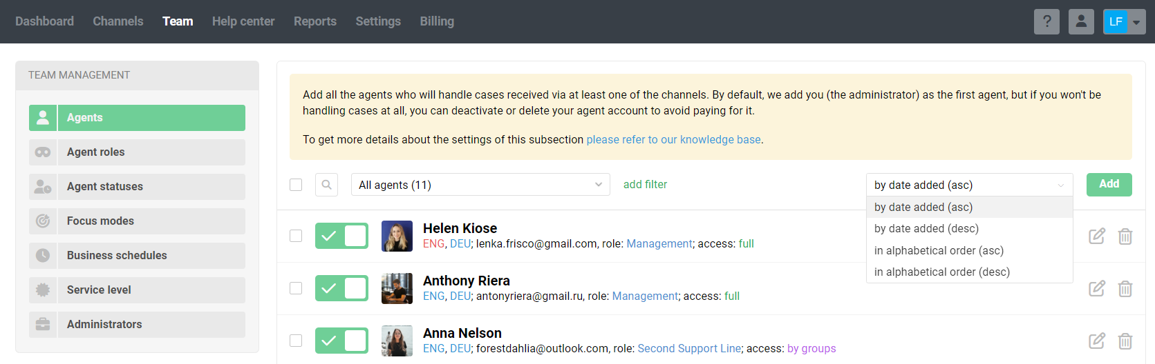 The "Agents" subsection in the "Team" section allows you to add agents and flexibly configure their access level/additional permissions. Let's take a look at the main features:
