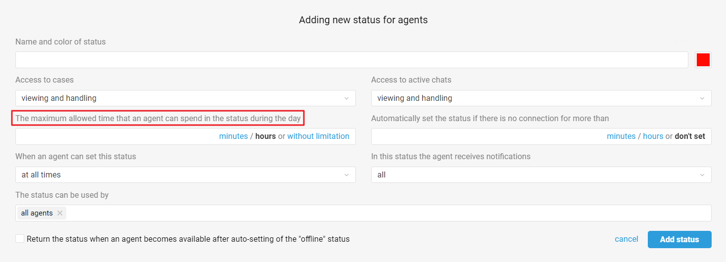 If an agent has a strictly limited time, for example, for a lunch break or self-study, create an appropriate status and indicate the time available to the agent in this field so that when it ends, the agent sees a window for choosing a status and moves on to other tasks.